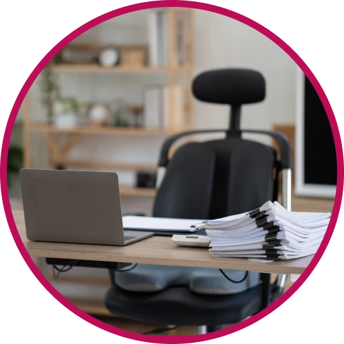 Equipamiento de trabajo eficiente: escritorios, sillas ergonómicas, monitores, accesorios de red, laptops y consumibles.